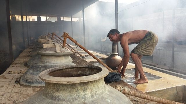 Когда мы впервые вошли в традиционный дистилляционный завод, я понял, что попал в мир, который, как я думал, не может существовать в наше время. Ряды медных перегонных кубов или «дегов» располагались на глиняных печах, под которыми горели дрова, разжигавшие огонь. Кадры вмещали около 100 фунтов цветков бархатцев (Etageres erect), погруженных в воду. Из вершины «дегов» под углом торчали бамбуковые трубы, обернутые шпагатом из местных трав. Эти трубы, или «чонги», соединяли «деги» с другим медным сосудом с длинным горлышком, называемым «бхапка», который находился на водяной бане под более крупным сосудом. В этом сосуде меньшего размера хранилось драгоценное сандаловое масло, в котором конденсировались ароматические пары, образующиеся при «деге». Этот уникальный процесс гидродистилляции цветочных паров с получением сандалового дерева использовался для производства так называемого «аттара». Ощущение, окружавшее этот процесс, было действительно необыкновенным. За огнем следили люди, которым приходилось следить за выделением тепла путем наблюдения и опыта. Не существовало современных датчиков температуры, которые могли бы сообщить такие вещи. Эта важная задача была поручена людям с многолетним опытом изготовления «эфирного масла», потому что, если температура станет слишком высокой, вода на градусах испарится и быстро вызовет «сгорание» цветов, что испортит запах сандалового дерева. Незначительная ошибка может стоить тысячи долларов. Другие люди регулярно проверяли нагрев ресивера, ощупывая его внешний периметр. Водяная баня, в которой находился приемник, должна была поддерживать определенную температуру, чтобы происходила правильная конденсация ароматических паров. Как только окружающая вода стала теплой, добавляли свежую прохладную воду. Об этих и многих других деталях заботились в спокойной, упорядоченной манере.