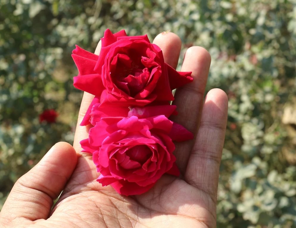 Розы долины Инда среднего размера и ярко-красного цвета, с изысканным ароматом, немного более интенсивным, чем у розовой розы.