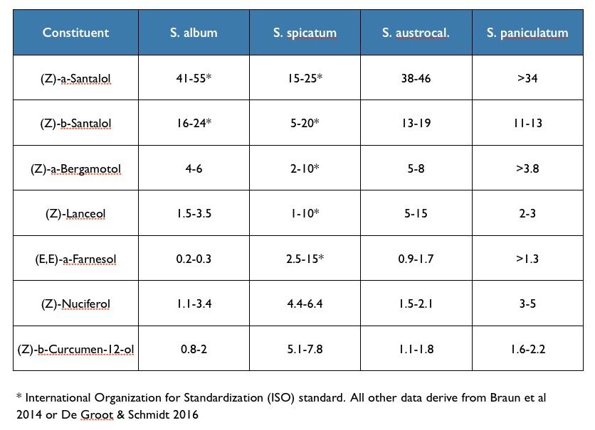 Стандартные диапазоны содержания компонентов эфирного масла сандала: